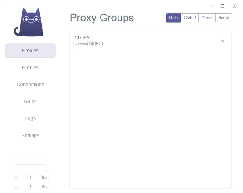 在添加为订阅地址之后,需要选择一个代理节点使用,点击软件主界面左侧的 代理 选项卡,软件右上角代理规则处默认保持 规则 即可,代理模式主要有以下四种: