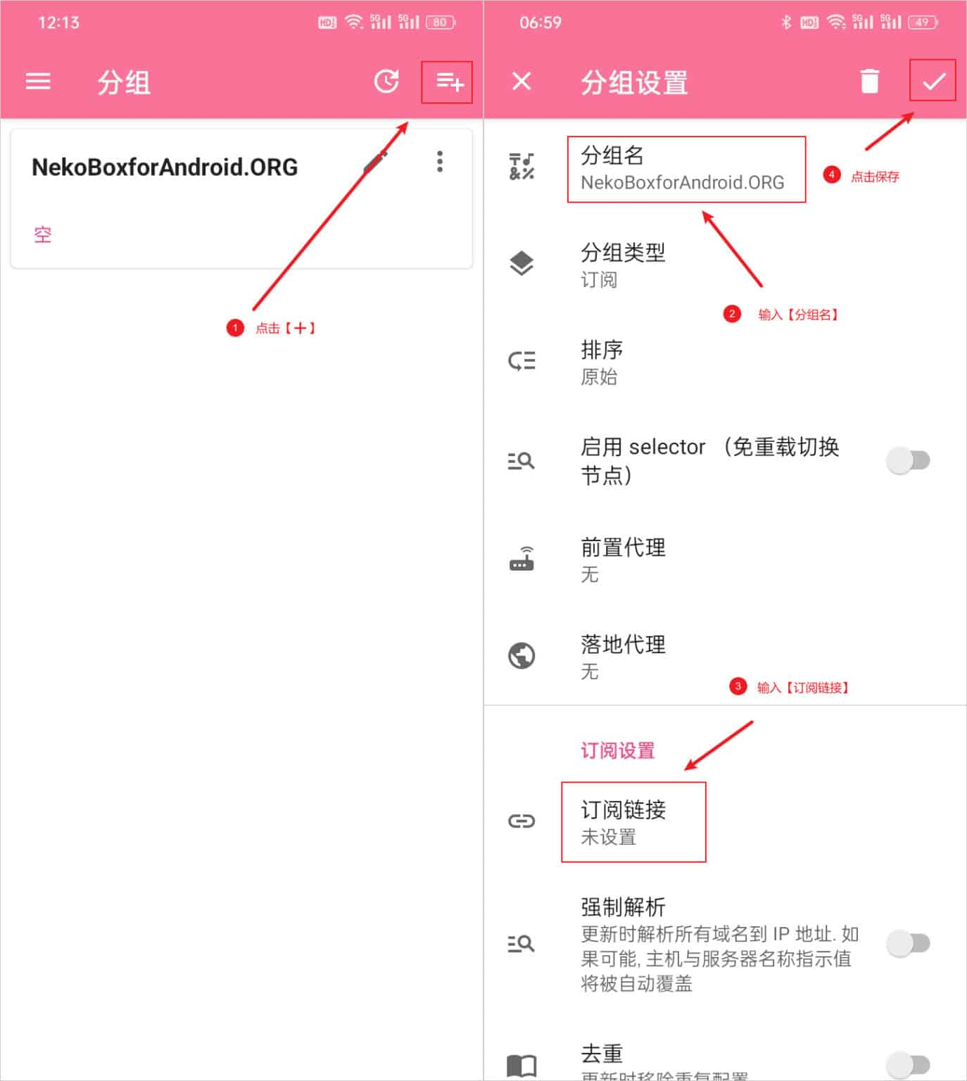 在弹出的分组主界面,点击右上角的 ➕ 号按钮即可出现分组设置界面,在分组名输入自己能区分这个分组的内容,分组类型选择订阅,然后在分组设置的订阅链接复制节点订阅地址,点击右上角的 ✔ 按钮保存即可,如下图所示: