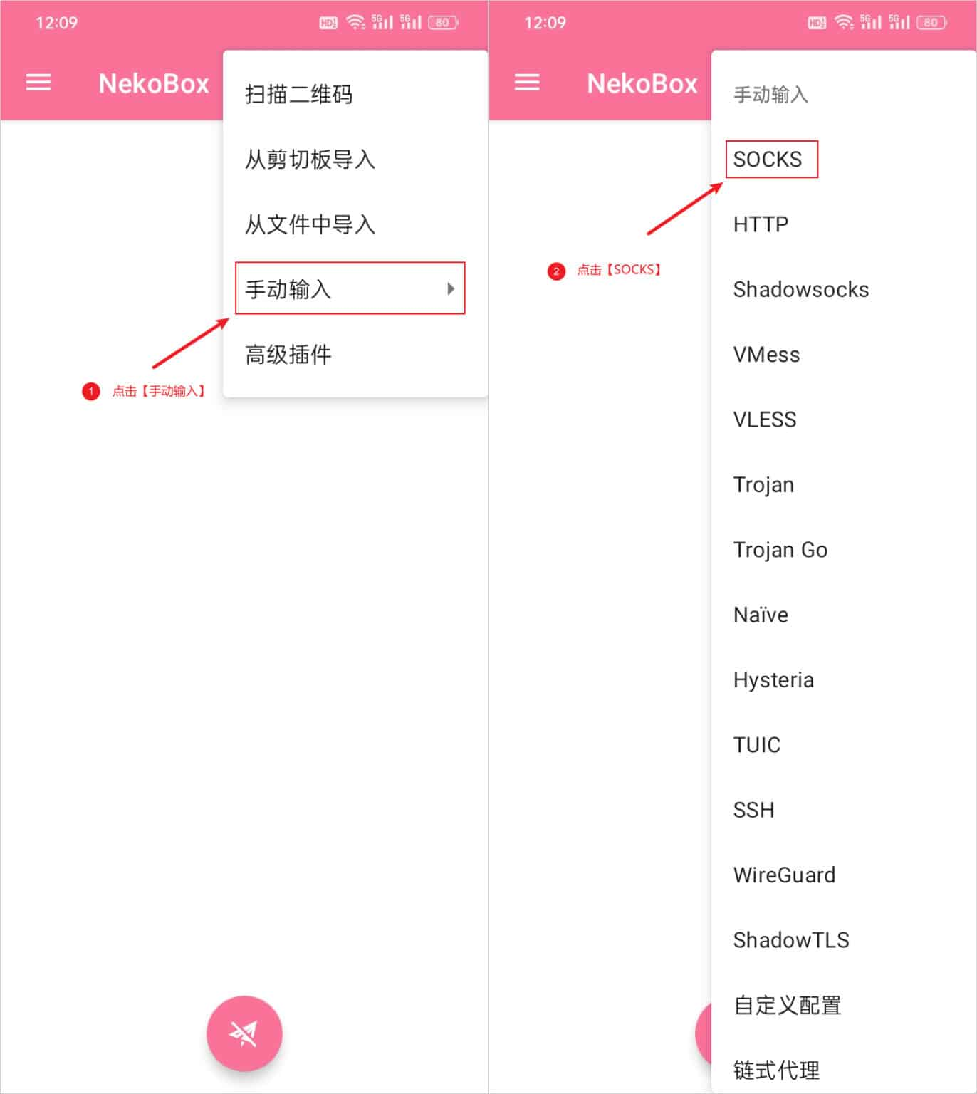 配置 Socks 服务器节点,通过点击软件主界面右上角的 ➕ 号按钮即可出现添加配置文件选项,选择手动输入,随后在弹出的窗口中选择 Socks 选项,如下图所示: