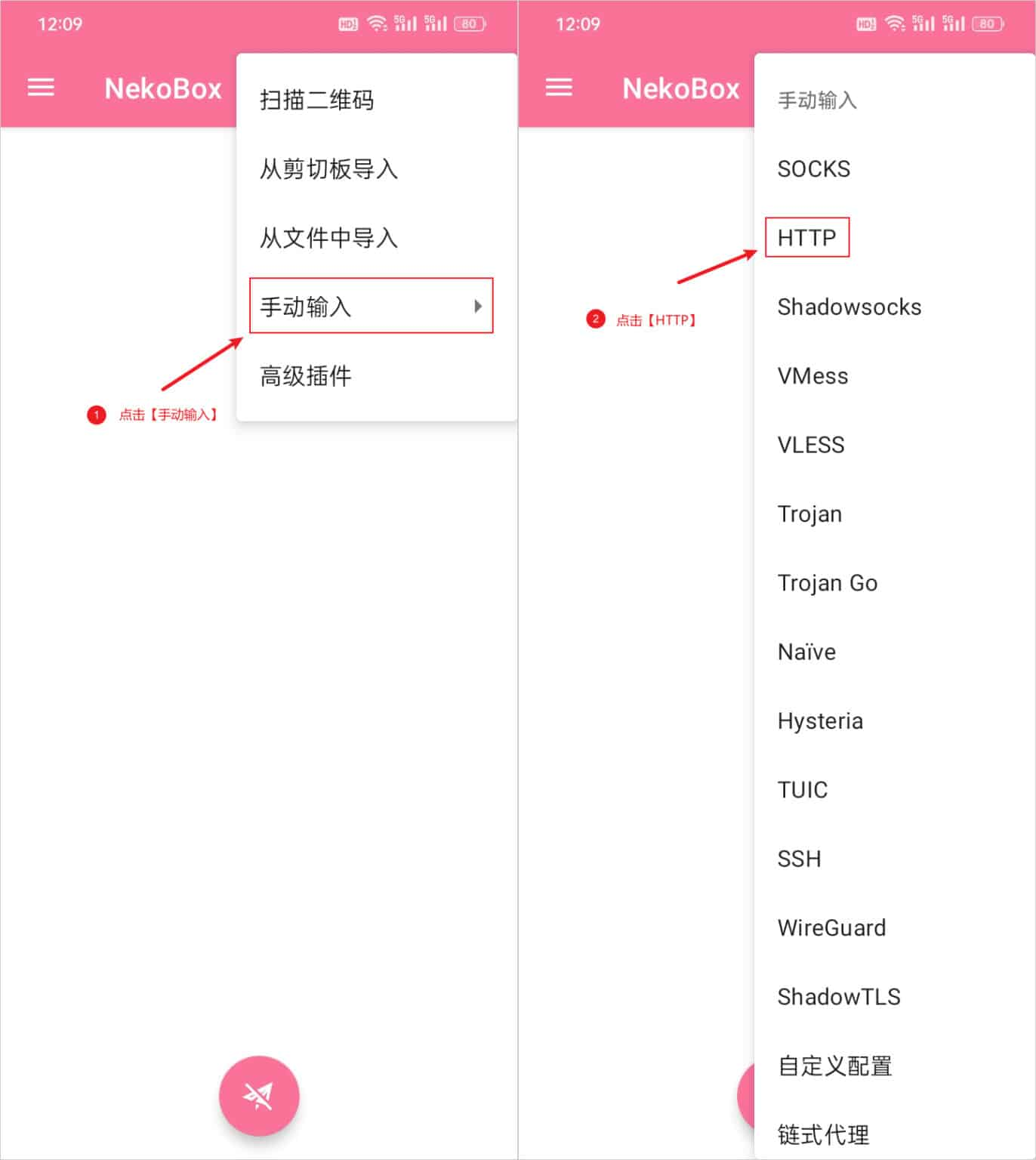 配置 HTTP 服务器节点,通过点击软件主界面右上角的 ➕ 号按钮即可出现添加配置文件选项,选择手动输入,随后在弹出的窗口中选择 HTTP 选项,如下图所示:
