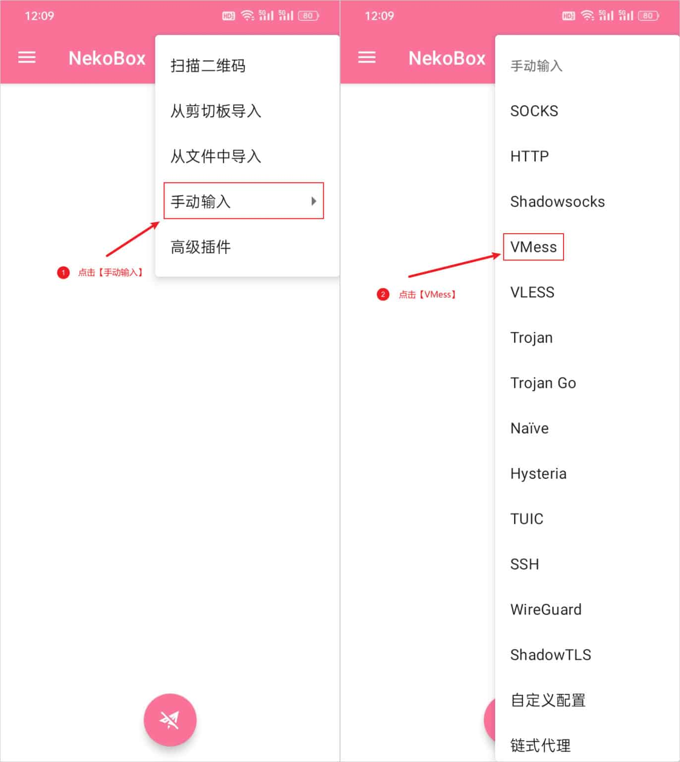 配置 VMess 服务器节点,通过点击软件主界面右上角的 ➕ 号按钮即可出现添加配置文件选项,选择手动输入,随后在弹出的窗口中选择 VMess 选项,如下图所示: