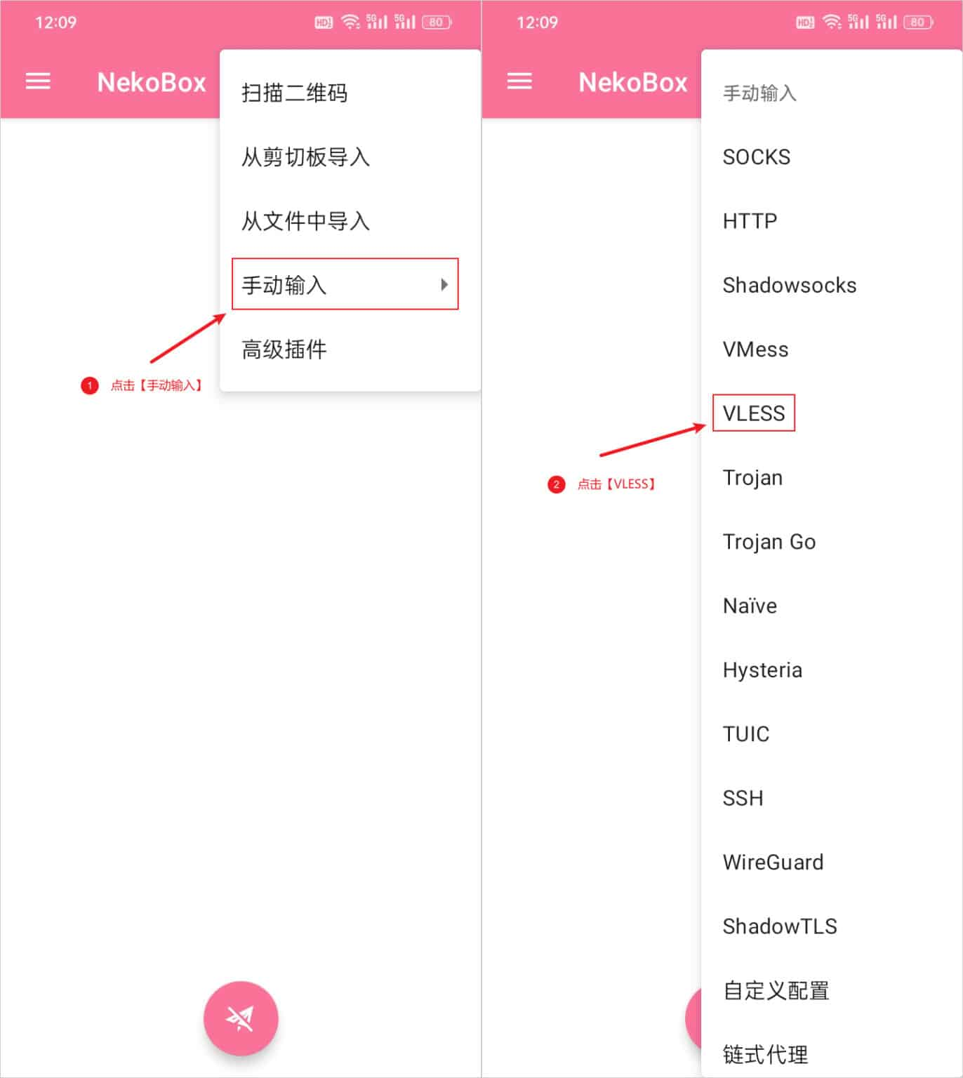 配置 VLESS 服务器节点,通过点击软件主界面右上角的 ➕ 号按钮即可出现添加配置文件选项,选择手动输入,随后在弹出的窗口中选择 VLESS 选项,如下图所示: