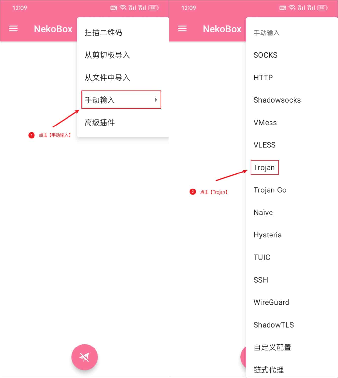 配置 Trojan 服务器节点,通过点击软件主界面右上角的 ➕ 号按钮即可出现添加配置文件选项,选择手动输入,随后在弹出的窗口中选择 Trojan 选项,如下图所示: