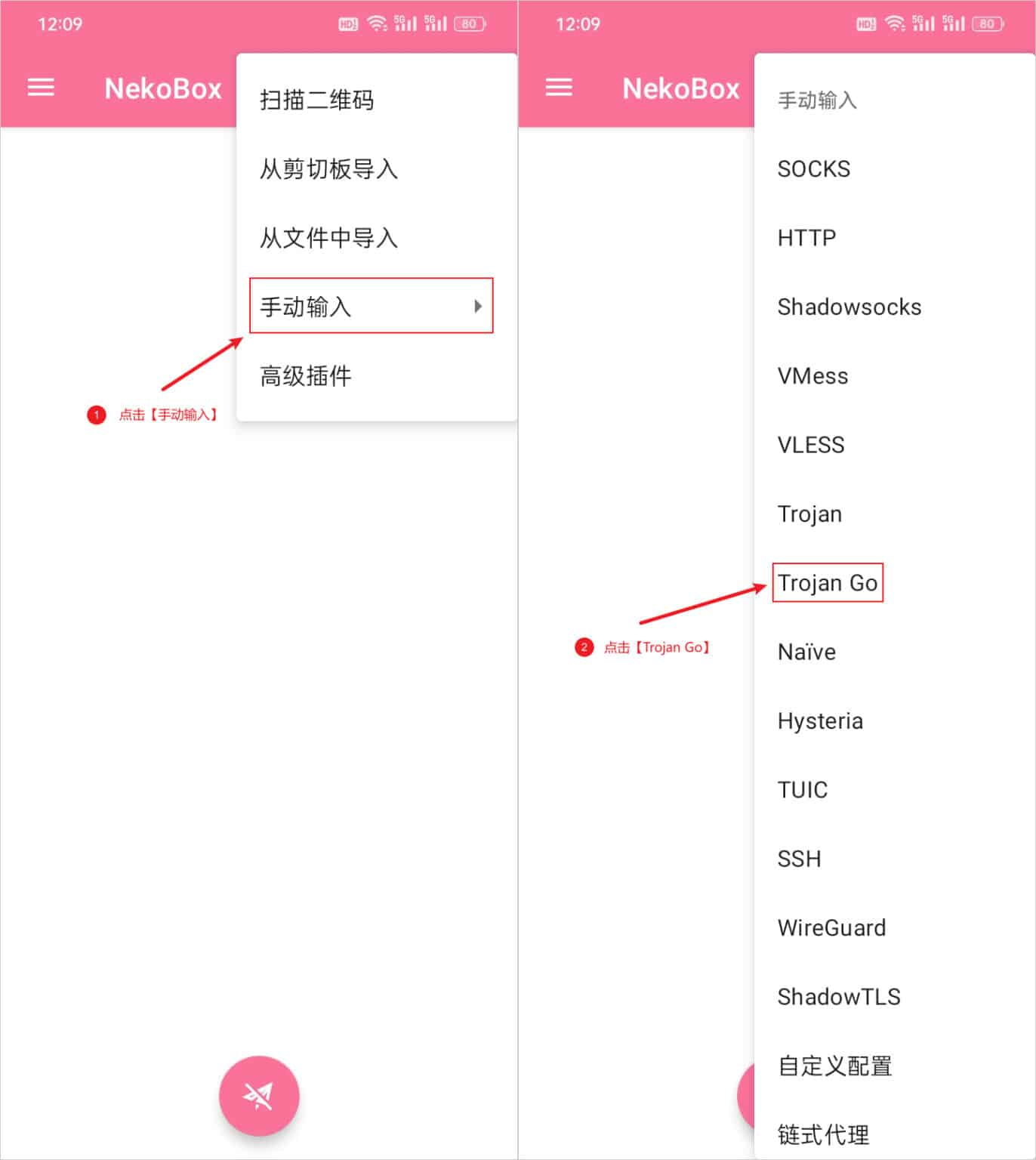 配置 Trojan Go 服务器节点,通过点击软件主界面右上角的 ➕ 号按钮即可出现添加配置文件选项,选择手动输入,随后在弹出的窗口中选择 Trojan Go 选项,如下图所示: