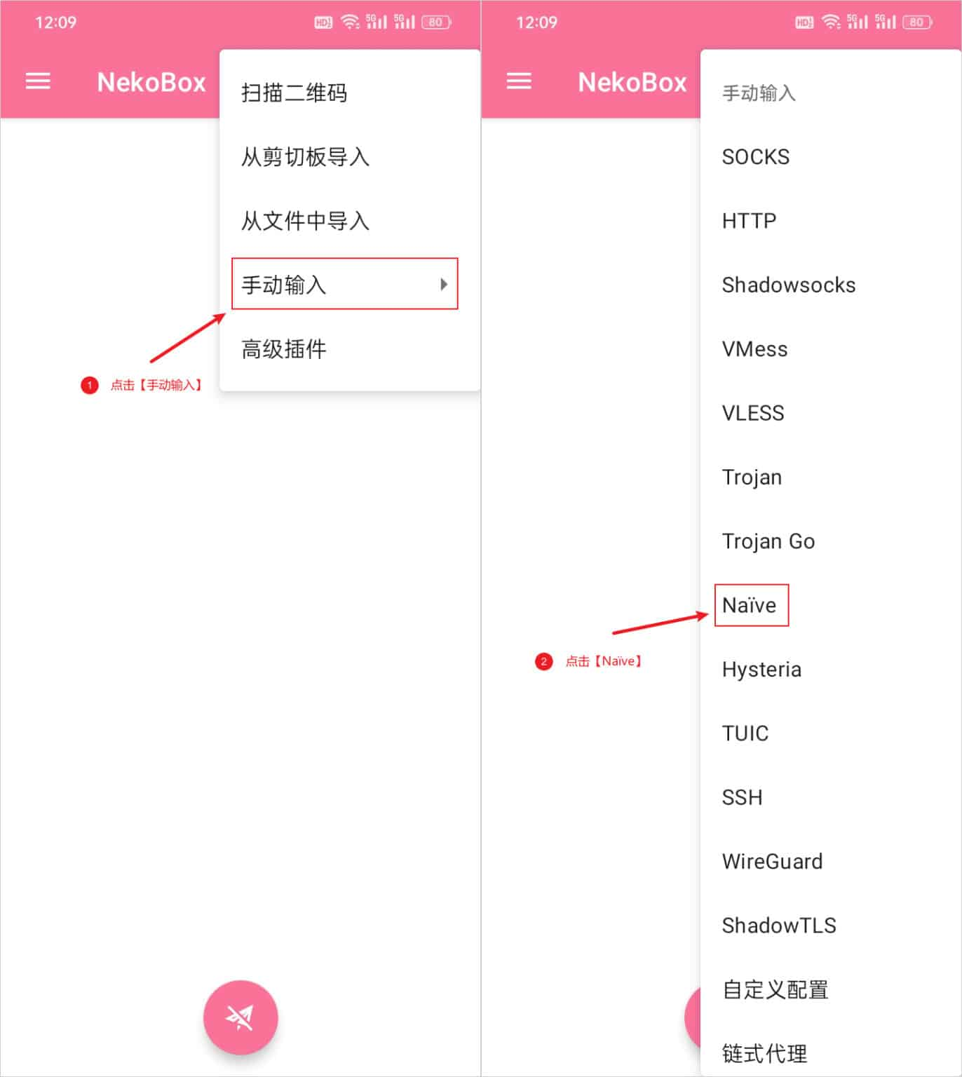 配置 Naïve 服务器节点,通过点击软件主界面右上角的 ➕ 号按钮即可出现添加配置文件选项,选择手动输入,随后在弹出的窗口中选择 Naïve 选项,如下图所示: