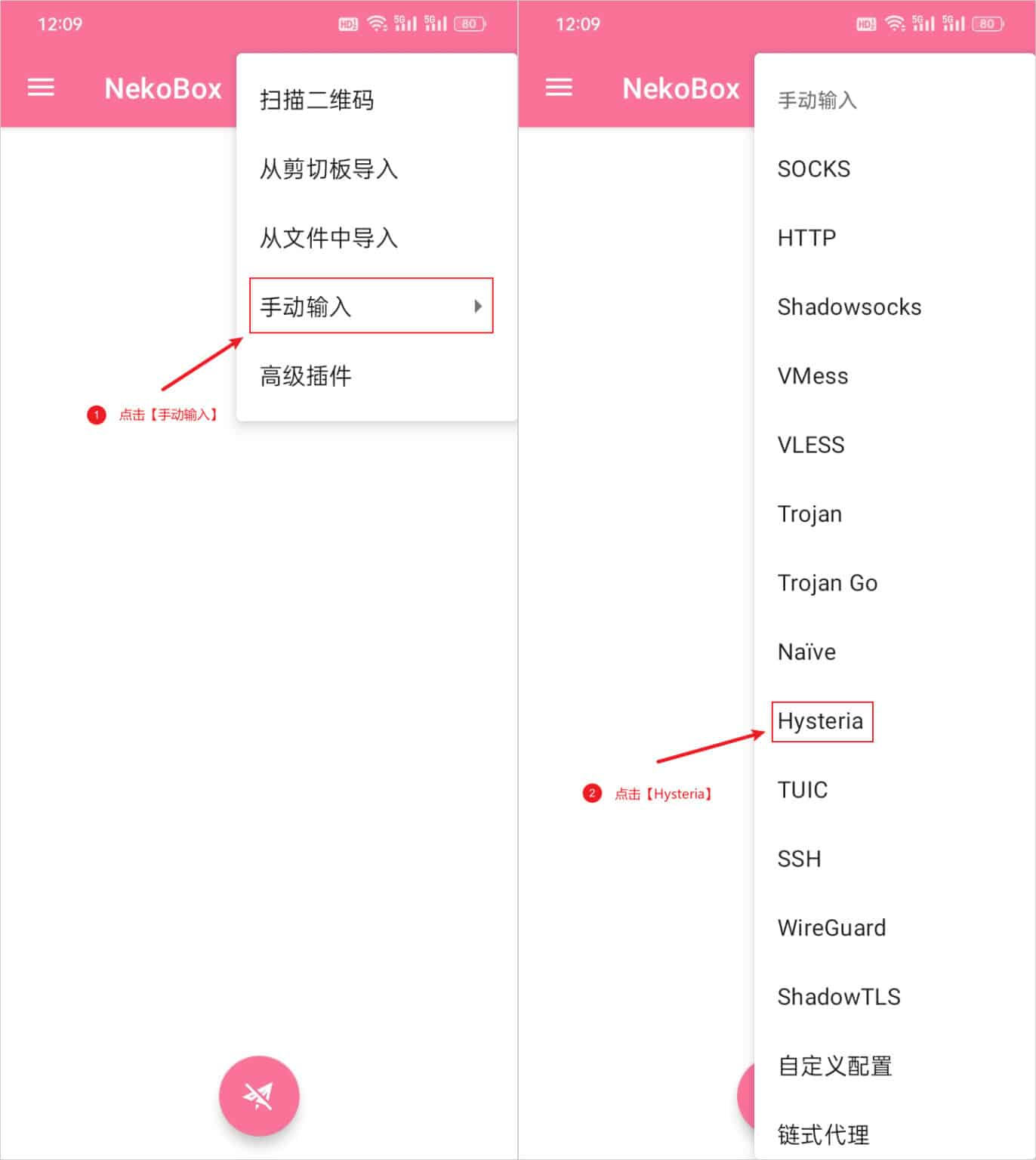 配置 Hysteria 服务器节点,通过点击软件主界面右上角的 ➕ 号按钮即可出现添加配置文件选项,选择手动输入,随后在弹出的窗口中选择 Hysteria 选项,如下图所示: