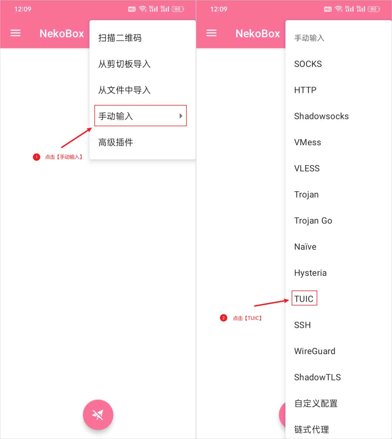 配置 TUIC 服务器节点,通过点击软件主界面右上角的 ➕ 号按钮即可出现添加配置文件选项,选择手动输入,随后在弹出的窗口中选择 TUIC 选项,如下图所示: