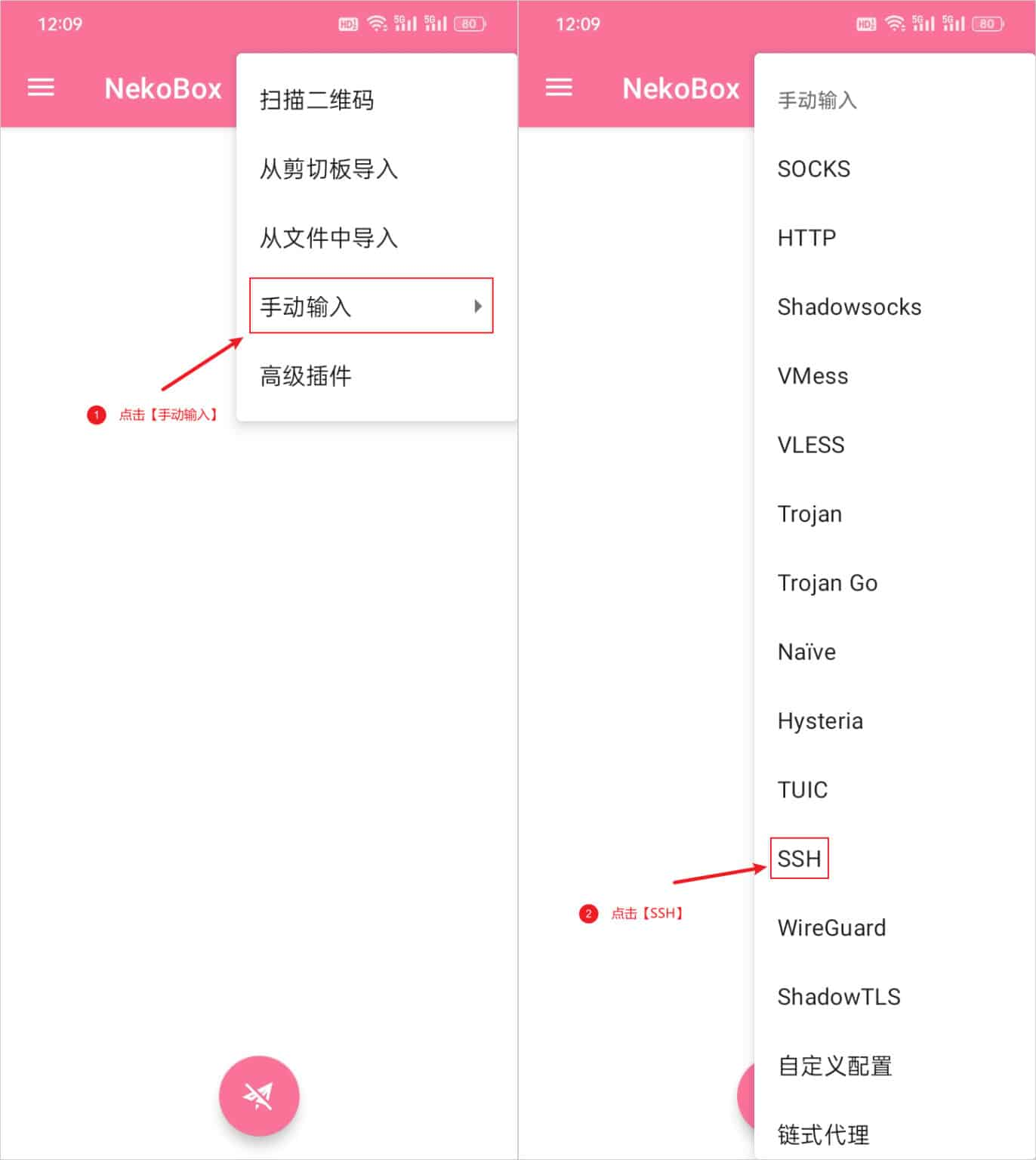 配置 SSH 服务器节点,通过点击软件主界面右上角的 ➕ 号按钮即可出现添加配置文件选项,选择手动输入,随后在弹出的窗口中选择 SSH 选项,如下图所示: