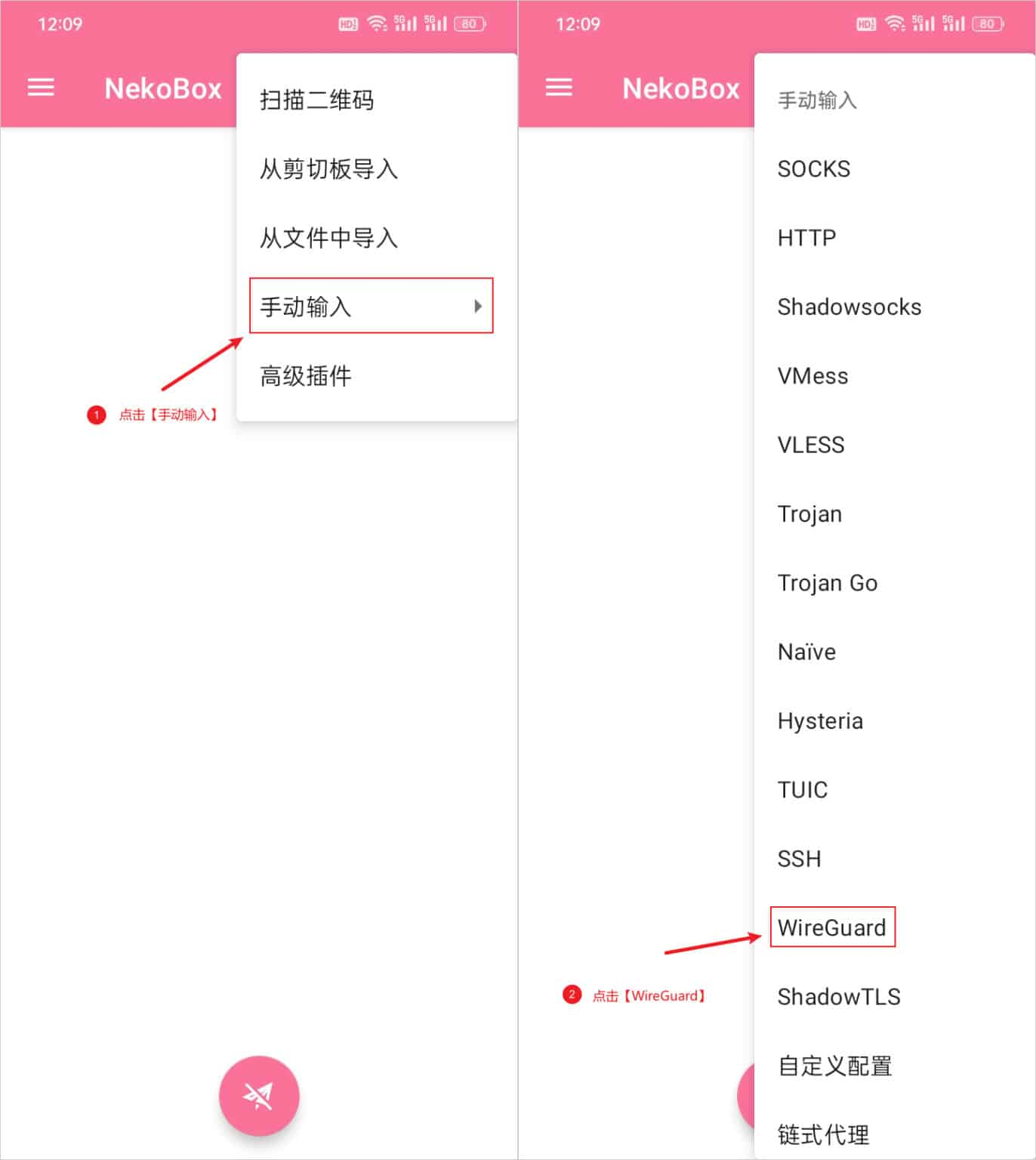 配置 WireGuard 服务器节点,通过点击软件主界面右上角的 ➕ 号按钮即可出现添加配置文件选项,选择手动输入,随后在弹出的窗口中选择 WireGuard 选项,如下图所示: