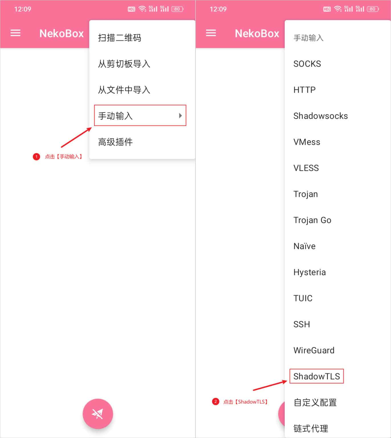 配置 ShadowTLS 服务器节点,通过点击软件主界面右上角的 ➕ 号按钮即可出现添加配置文件选项,选择手动输入,随后在弹出的窗口中选择 ShadowTLS 选项,如下图所示: