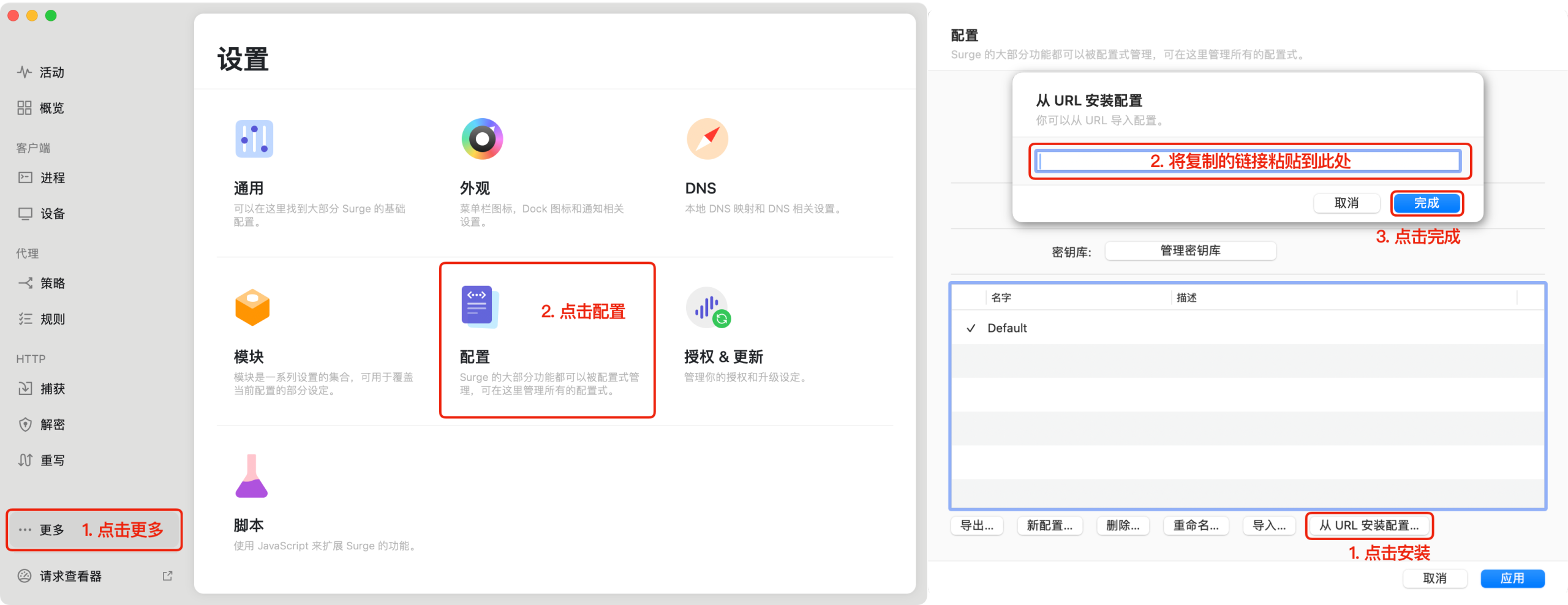 1. 打开 Surge,点击左侧「更多」 > 「配置」